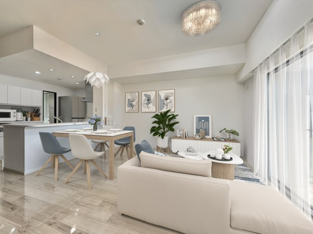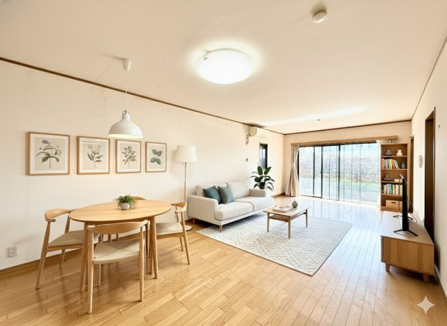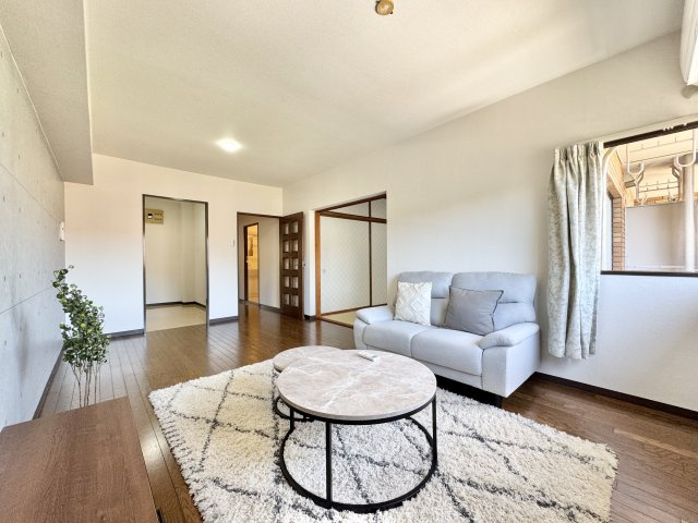 【居間・リビング】約17.5帖のリビングになります! 角部屋ならではの多数の窓から差し込む陽射しが、部屋全体を明るく気持ちの良い空間にしてくれます!